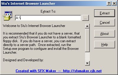 The IELaunch.exe program is a self-extracting single file that creates the setup disk for Stu's Internet Browser Launcher. You can download this program from the previous page or by clicking here. As a starting point, you should download the file to your Desktop or to a downloads folder on your C: drive. Click the download link and choose the option to Save to Disk. Once downloaded, run the IELaunch.exe program to extract the installation files. The following screen will be displayed.