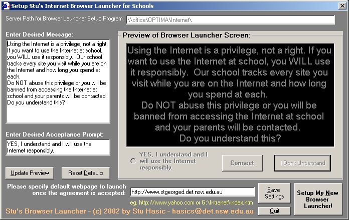 The Setup program allows you to customise the Browser Launcher message and the Acceptance prompt and specify the default webpage you want the Launcher to show when the browser is started. Changes can be made to the two large text fields on the left, then by clicking the "Update Preview" button, you can see how those changes will affect what students will see when they want to connect to the Internet. You can make as many changes as you like to the fields on the left and update the preview as many times as you like. There are default settings included in the Launcher Setup program, similar to the messages shown above, so if you wish to start again, click the "Reset Defaults" button.